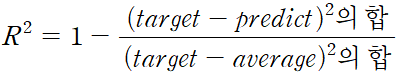 위의 결과에서 분류의 경우는 테스트 세트에 있는 샘플을 정확하게 분류한 개수의 비율, 즉 정확도(정답을 맞힌 개수의 비율)이다. 그러나 회귀에서는 예측하는 값이나 타깃 모두 임의의 수치이기 때문에 정확한 숫자를 맞힌다는 것은 거의 불가능하다. 그래서 회귀의 경우는 결정계수(Coefficient of Determination) 혹은 R²라고 부르는 점수를 이용한다.
