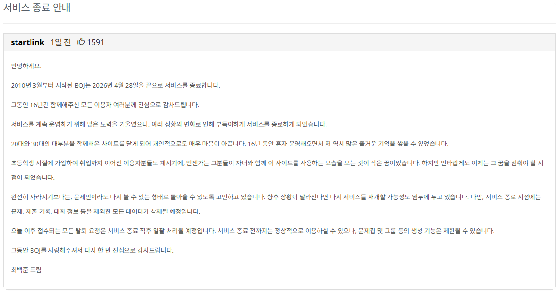 안녕, 나의 알고리즘 성지 '백준(BOJ)'대학 시절, 코딩테스트를 처음 시작하며 가장 먼저 발을 들인 곳은 백준(Baekjoon Online Judge) 사이트였다. 개발자나 IT 직군이라면 모르는 사람이 없을 정도로(모르는 사람도 꽤나 있는 듯하다..), 코테 준비의 1순위이자 상징과도 같은 곳이다. 그런데 갑작스러운 서비스 종료 소식을 접하니 마음이 참 착잡하다.2년 동안의 치열했던 기록들지난 2년은 백준과 함께 지지고 볶았던 시간이었다. 매일 사이트에 접속해 문제를 풀며 느꼈던 감정들이 아직도 선명하다.성취감의 반복: 어려운 문제에 막혀 스트레스를 받다가도, '맞았습니다!!'를 보기 위해 수십 번 제출 버튼을 누르던 간절함이 있었다.성실함의 증명: 깃허브 잔디를 채우기 위해 아무리 풀기 싫은 날에..